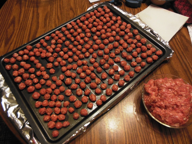 That's who my beloved Durwood turned into after supper last night. DD & DIL2 had an errand to run and then gifts to wrap (how convenient!) so I was pressed into service in the meatball sweatshop. (actually I volunteered so that the girls wouldn't have to run around like crazed weasels this morning) I know these look like two pictures of the same pan of meatballs but they're not. This is what 2 lbs. of ground meat makes when your sweatshop master makes you make teeny tiny meatballs. Do you realized that tomorrow's the last day of 2012? I can't believe it but I have to say I'm glad to see it go. We spent too much time in doctor's offices this year but on the other hand we had one of the best vacations ever when we drove out to Yellowstone National Park where they keep the geysers and the buffalo roam. BUFFALO! I want one. Mmm, maybe not, they're a bit large for my small yard although that segues nicely into today's Photo a Day theme which is "something that made you smile this year." The aforementioned western vacation fits that bill perfectly. We. Had. A. Blast. And thinking about it still makes me smile. Those two weeks were the gift to ourselves that keeps on giving. Speaking of gifts (another boffo segue) today's the day we finally open our gifts. Yay! There's an enticing pile of gifts under the tree and more will come with DS & DIL1. Prezzies! Teehee, I love presents, but I'm really excited to give presents. Porter's coming too but she already got hers. I couldn't wait. What's going to happen when I have a grandchild or two? I'm going to turn into Mom--in the best sense of Mom because she was enchanting with her grandkids and they loved her (still do) for it. Well, now I miss her a lot again.