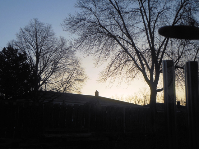 Very poetic, no? Yesterday after work I came back into the bedroom to change into my play clothes and the sun was just sliding into the notch made by the neighbor's roof and tree so I scurried to grab the camera. Then before I locked the patio doors and closed the curtain after dark I zipped out to top up the birdbath and saw the full moon (Wildcat Moon) so I grabbed the camera again. It's harder to take a moon picture because I can't convince the darned camera to not gather all the light making it look much brighter outside than it is. That's when I miss film, but most of the time I love digital, so immediate.