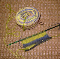 I spent a lot of the day stringing about 650 tiny beads onto 200 yds. or so of yarn so I could cast on a Like Magic beaded scarf. The magic part is you knit and purl along, regularly adding beads, then when you're almost out of yarn you drop stitches from end to beginning which makes a simple beaded lace scarf. Since I'm using smaller yarn and smaller beads than the pattern calls for I consulted with LB at knitting last night and added a couple more columns and I'd decided on my own to double up the beads. This is the first time I've really made anything with beads aside from a few accent beads I added with the crochet hook method so dealing with that many beads already strung on the yarn and having to be pushed down the yarn often is kind of a pain but I'm anxious to get to the dropping stitches part.