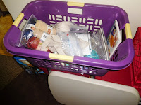 The big thing I want to accomplish today is to de-nest the couch area where I basically resided for the last 2 1/2 months. Now, I'm not saying that there won't be a yarn holding area, a knitting basket, and a knitting bag there, and I am confident that there will be patterns, recipes, magazines and assorted tools littering the coffee table, but those are all "normal" clutter. What's changing is the little adjustable table goes back downstairs as does this laundry basket of knitting stuff that has collected. The little bin of markers, thank you notes, crossword puzzle books and other entertainments that spent the time under the coffee table will be disseminated too. I feel this is another step toward getting back to normal.