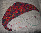 Tonight at Friday Night Knitting I got through another eyelet section on the DK Shawl. Somehow I've ended up with two extra stitches so I'll only increase on one of the next six rows instead of on three of them. That will get me back to the correct number of stitches without my having to go back and figure out where I went wrong. This variegated yarn is so busy that I think that it hides my booboos well.
