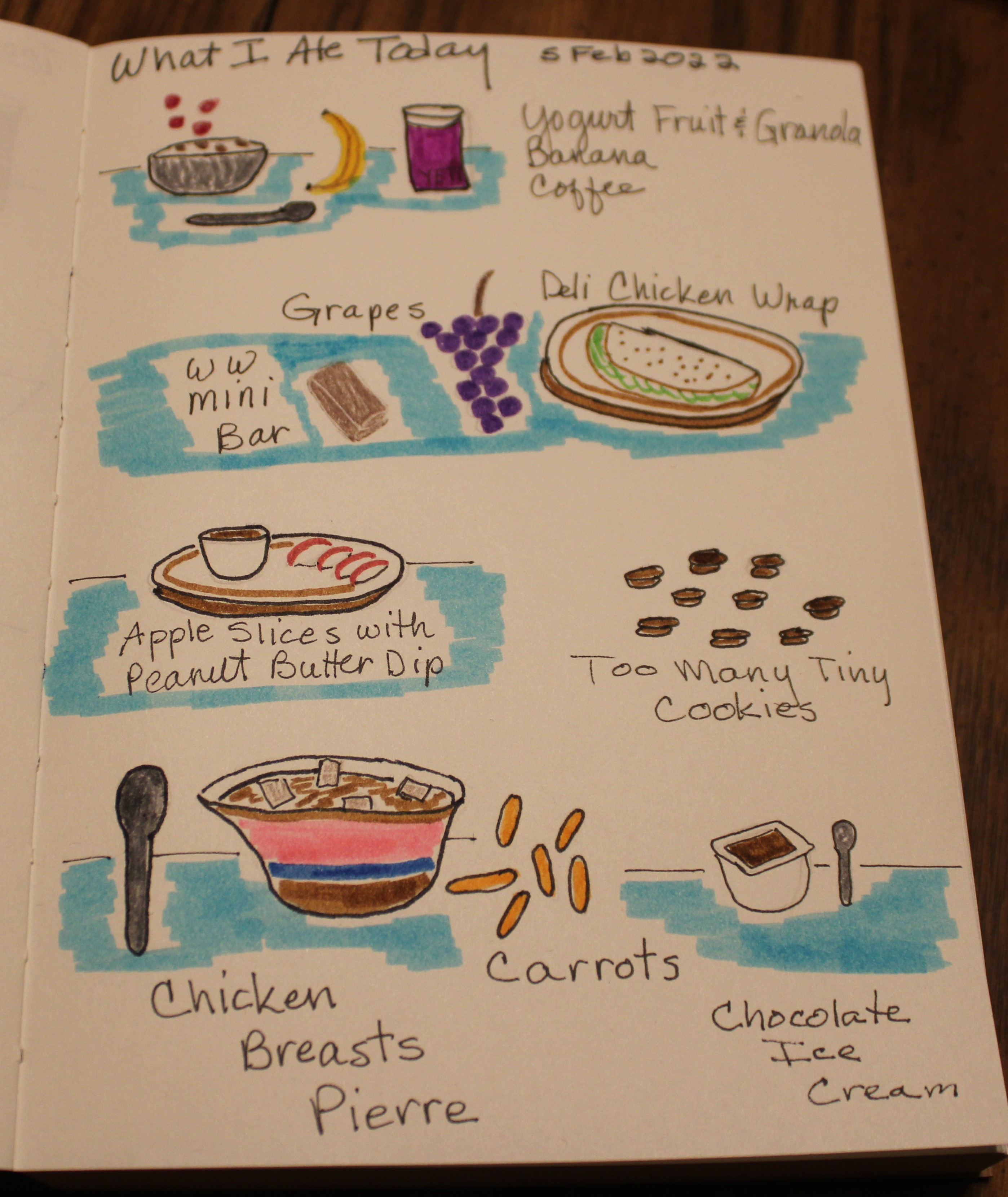 As the next Illustrated Journal video said, I kept a list of everything I ate today and after supper I made a page of it. My page isn't as comic book-y as hers was but I like it. I'll work on upping my game.