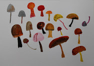 Today's Daily Practice was mushrooms. She gave us two pages of examples and then just painted mushrooms from her imagination. I have a hard time making them oddball colors so I just went my own way once I got started. That sole pink one with red dots in the middle is my only attempt at her aesthetic.