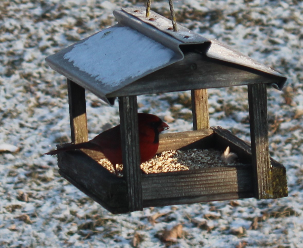 I looked out and saw this Cardinal on the platform feeder this morning. He wasn't willing to share the space with the House finch. Then he went down onto the ground under the tube feeder but he didn't stay long.